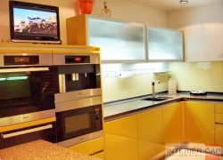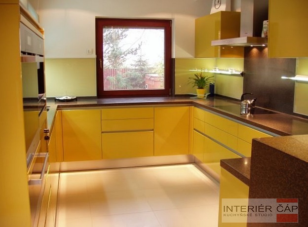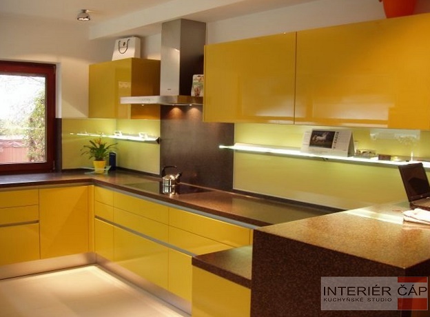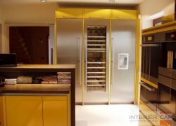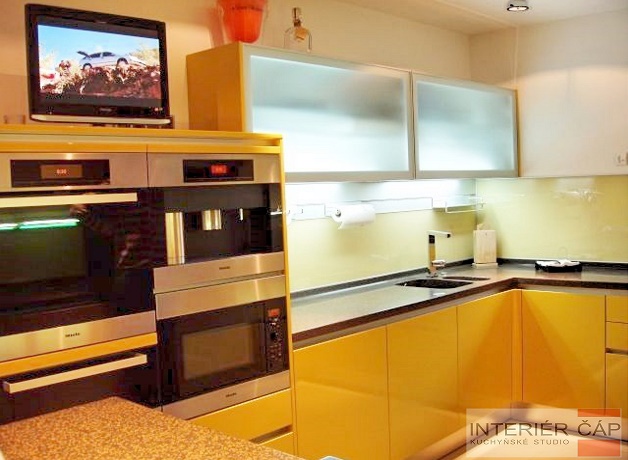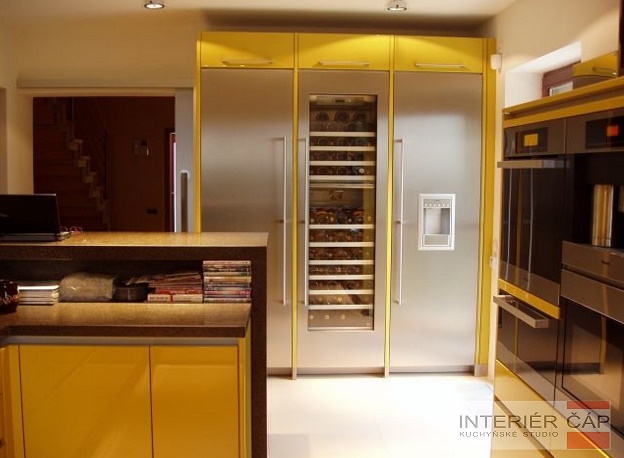 Provedení lak vysoký lesk, pracovní deska Corian, elektrospotřebiče Miele, lednice, mrazák a vinotéka Gaggenau.